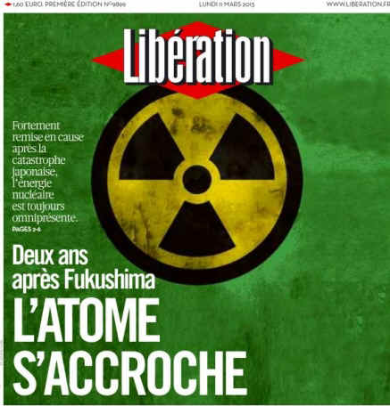 Lundi 11 mars 2013, deux ans jour pour jour après le début de la catastrophe de Fukushima. Logiquement, Libération fait sa Une sur le nucléaire, mais de façon fort curieuse. Le titre, déjà, donne le ton : "Deux ans après Fukushima, l’atome s’accroche", avec cette précision parfaitement mensongère : "Fortement remise en cause après la catastrophe japonaise, l’énergie nucléaire est toujours omniprésente".