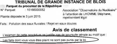 La mauvaise nouvelle maintenant : le Parquet de Blois nous a répondu ceci : « Les faits dont vous vous êtes plaint ne sont pas punis par la loi ». Non, vous ne rêvez pas : entre les lattes du Parquet, pas le moindre alinéa dans la loi française qui permette de poursuivre des rejets volontaires de plutonium dans la nature.