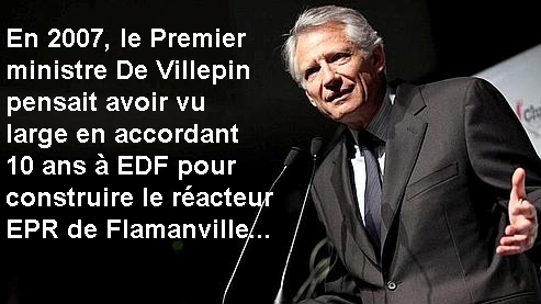 En 2007, en fixant à 10 ans ce délai pour un réacteur supposé être achevé en 4 ans et demi, M De Villepin pensait avoir vu large, mais c’était sans compter l’incompétence de l’industrie nucléaire française, qui est déjà la risée du monde industriel mondial pour le désastre de l’EPR qu’Areva ne parvient pas à construire en Finlande : il devait entrer en service en 2009 mais n’est toujours pas achevé à ce jour.