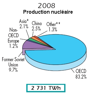 En page 6 de Key World Energy Statistics 2010 (qui donne les chiffres de 2008), on constate que la part du nucléaire est de 5,8% de l’énergie primaire mondiale. Et les énergies renouvelables sont à 2,2% + 10% + 0,7% = 13%, soit plus du double.